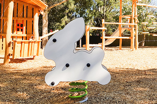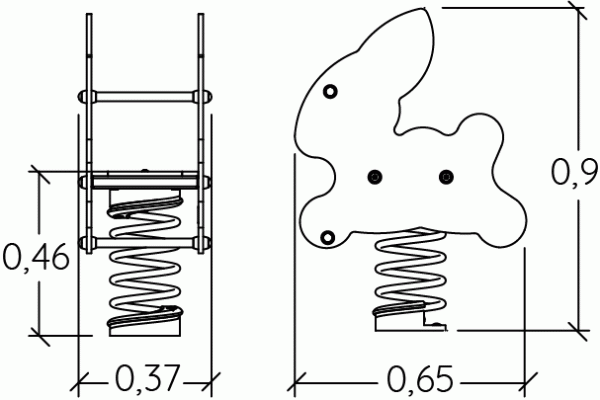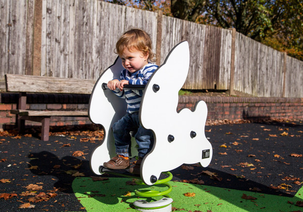 Boneco de mola inclusivo com a forma tridimensional de um coelho. Ideal para oscilar, socializar e equilibrar.
