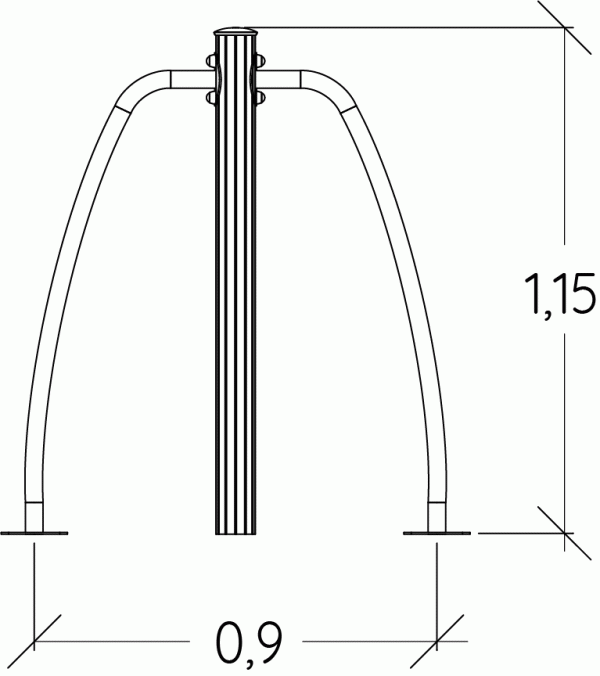 Suporte metálico para bicicletas composto por 2 suportes de aço inoxidável, diâmetro 40x2mm, fixos a um pilar de aço galvanizado, revestido a pó preto, com 102mm de diâmetro, espessura 2mm e protegido por uma tampa de alumínio pintada. Ideal para parques, jardins, escolas, entre outros. Para fixação a sapatas de betão.