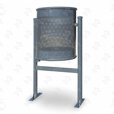 Papeleira metálica circular com 365mm de diâmetro fixa a uma estrutura metálica composta por 2 postes verticais e uma barra horizontal. Capacidade para 56 litros. Para fixação de superfície.