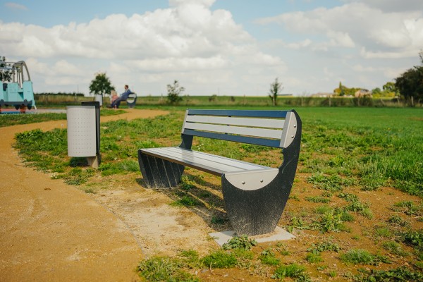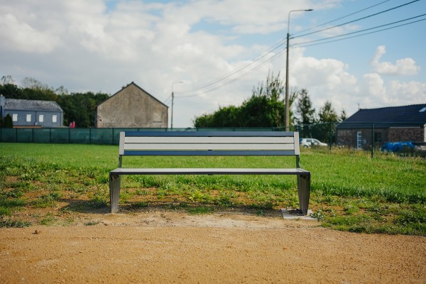 Materiais: O assento é uma combinação de aço pintado, 50x25x2.5mm e ripas de poliéster com pultrusão (poliéster compacto / fibra de vidro) 58x25x3mm, RAL 7004. Os montantes são feitos de aço pintado de 8 mm de espessura. Os suportes são feitos de aço inoxidável. Fixações de aço inoxidável, protegidas por tampas antivandalismo em poliamida.