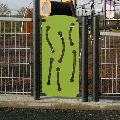 Módulo de vedação composto por um painel compacto colorido, com 0,65m de comprimento e com 6 recortes decorativos. Ideal para espaços de jogo e recreio. Para fixação em postes G2886A.