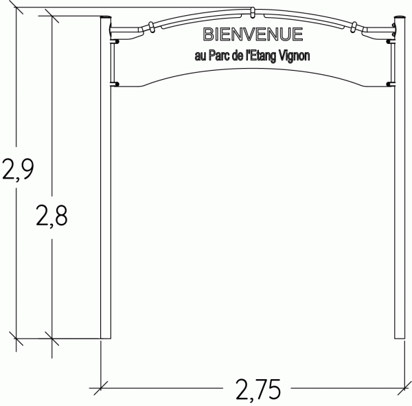Pórtico informativo simples, para gravação personalizada de informação em 1 das faces do painel. Composto por 2 postes de aço com 102mm de diâmetro e 2mm de espessura e tubo em aço inoxidável com 40mm de espessura, aos quais está fixo o painel simples.