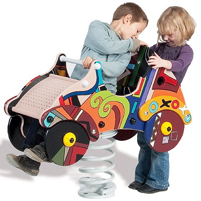 Boneco de mola com a forma tridimensional de um colorido carro, com decoração gráfica especial GG Etnik. Ideal para balançar, equilíbrio, socializar e play role.