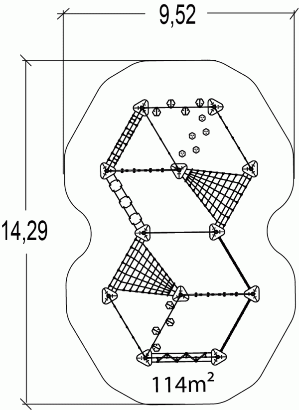 Materiais: Os postes de 125 mm de diâmetro são feitos de aço galvanizado lacado. O acabamento granulado cinza de dois tons tem uma superfície levemente ondulada para maior resistência a arranhões. As tampas são feitas de poliamida moldada por injeção. Os pisos da plataforma são feitos de um material de polietileno antiderrapante de 18 mm de espessura. As cordas, com 16mm de diâmetro, são feitas em cabo de aço galvanizado coberto por poliéster. Os cabos são unidos e mantidos no lugar por esferas de poliamida injetada. Os acessórios de rede são feitos de poliamida e compostos por duas partes distintas para facilitar a manutenção dos fios individuais. Elementos de alumínio injetado são fixados nos postes com parafusos autoperfurantes para fornecer ligações entre as cordas e os postes. As fixações de poliamida moldada por injeção conectam os postes às plataformas e aos vários acessórios de jogo. São não-tóxicas, à prova de chamas e resistentes aos U.V. A espessura da poliamida torna o equipamento forte e resistente a vandalismo. Os tubos são fabricados em aço inoxidável com 40 mm de diâmetro, garantindo durabilidade e confiabilidade duradouras ao equipamento. Cada faixa é composta por 3 cordas unidas por alicates de alumínio. Cada corda, com 16mm de diâmetro, é feita em cabo de aço galvanizado coberto por polipropileno. As presas de escalada são feitas de polipropileno. Elas são não-tóxicas, não inflamáveis e resistentes a choques e UV. Dão força às unidades e ajudam a protegê-las contra vandalismo. Fixações de aço inoxidável, protegidas por tampas antivandalismo em poliamida.
