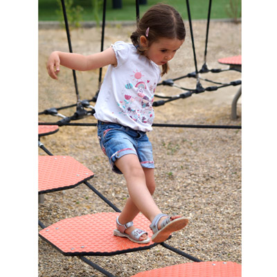 Circuito de exercício composto por 12 postes de aço com plataformas, 1 unidade de Slalom, 1 ponte de corda, 1 unidade de salto com 3 plataformas presas a 2 cordas horizontais, 2 passagens com degraus inclinados fixos a cordas verticais para apoio, 2 Slacklines, 2 pontes de corda com pegas de bolas suspensas para apoio, 1 passagem com barras presas por 2 cordas laterais e com cordas de apoio verticais, 1 escada horizontal com cordas verticais de apoio, 1 conjunto de degraus japoneses, 2 paredes de tubos com presas coloridas para trepar e 2 redes triangulares horizontais. Ideal para equilibrar, trepar e atravessar. Para fixação a sapatas de betão.