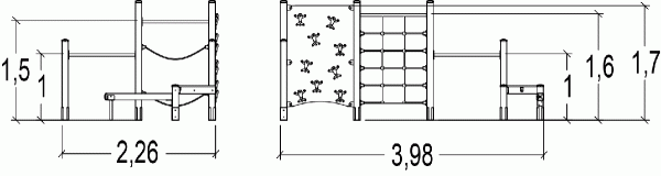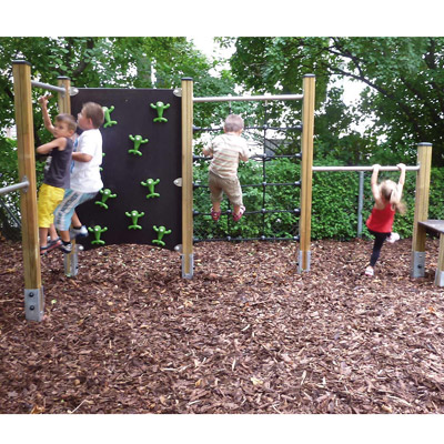 Equipamento desportivo composto por 1 barra horizontal com 1m de altura, para elevações, 1 atravessamento suspenso com 2 cordas, 1 parede de escalada com 1,7m de altura, com presas coloridas, 1 rede para trepar com 1,6m de altura, 1 barra horizontal com 1m de altura, para elevações, 1 plataforma BASIC com 0,52m de altura e 1 barra de equilíbrio. Ideal para trepar, suspender, balançar, escalar, socializar e atravessar.