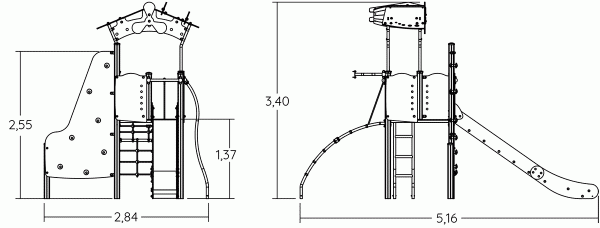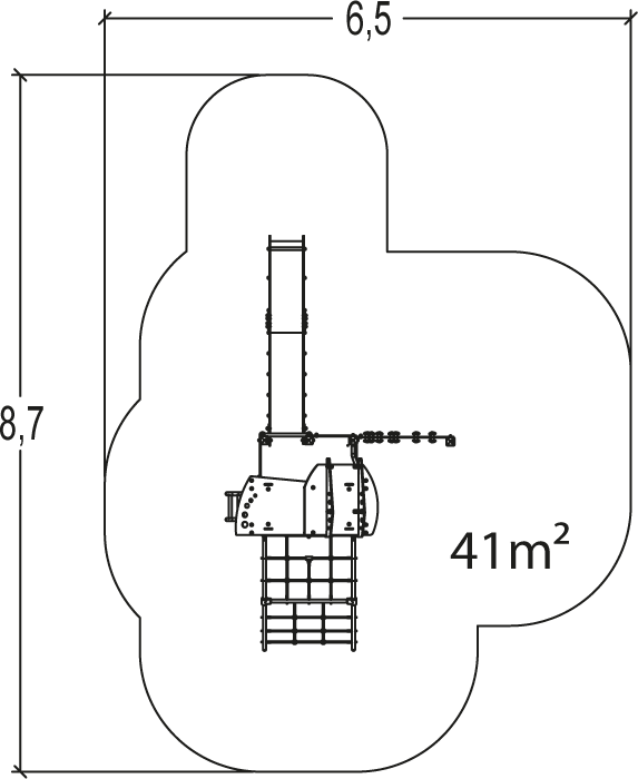Materiais: Painéis coloridos de HPL com 13 mm de espessura, com excelente resistência a intempéries e vandalismo. As plataformas e a parede de escalada são feitas de um material compacto texturizado e antiderrapante (HPL), com 12,5 mm de espessura. Tubos de aço inoxidável, com diâmetro 40mm. Fixações de poliamida moldada por injeção conectam os postes às plataformas e aos vários acessórios de jogo. Elas são não tóxicas, não inflamáveis, resistentes a choques e a radiação ultravioleta. A espessura da poliamida torna o equipamento forte e resistente ao vandalismo. Postes quadrados com 95mm feitos de aço galvanizado lacado, garantindo robustez e durabilidade, com tampas de poliamida moldada por injeção. As cordas são feitas de cabo de aço galvanizado coberto com polipropileno, e os cabos são ligados e mantidos no lugar por conectores de poliamida moldada por injeção. A superfície deslizante do escorrega é feita de aço inoxidável com 2 mm de espessura, moldado, dobrado e enrolado em uma única peça. Presas de escalada de polipropileno, não tóxicas, não inflamáveis e resistentes a choques e radiação UV. Fixações de aço inoxidável, protegidas por tampas antivandalismo em poliamida.