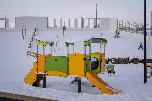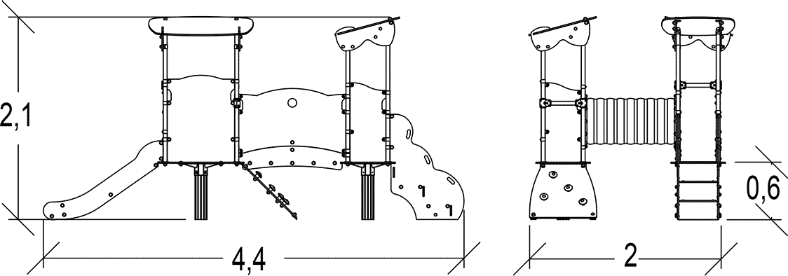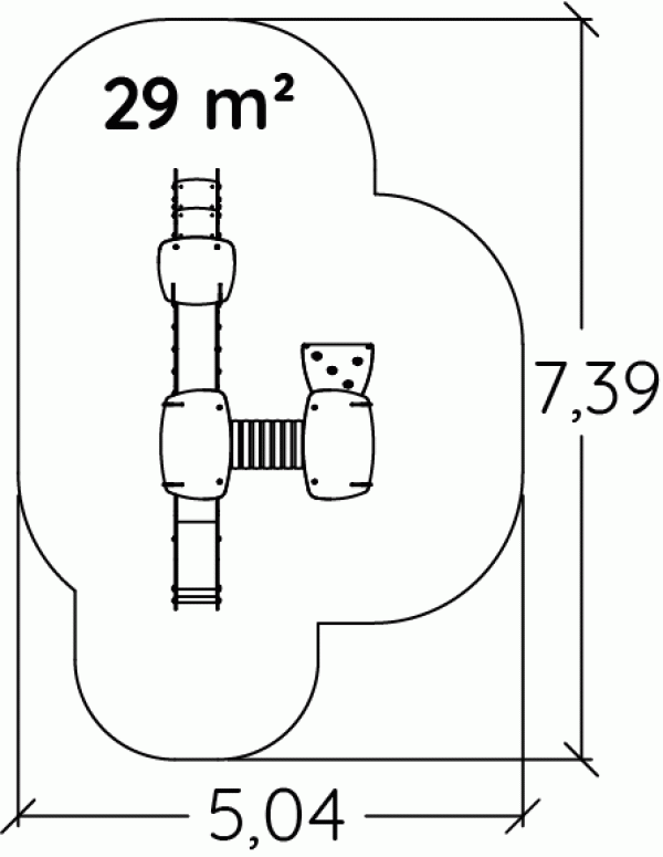 Materiais: Os postes de 125 mm de diâmetro são feitos de aço galvanizado lacado com acabamento granulado cinza de dois tons e superfície levemente ondulada para maior resistência a arranhões. Painéis coloridos de HPL com 13 mm de espessura, com excelente resistência a intempéries e vandalismo. As plataformas e os degraus são feitos de um material compacto texturizado e antiderrapante (HPL), com 12,5 mm de espessura. A passagem de 60 cm de largura é feita de um piso de alumínio chanfrado. Tubos de aço inoxidável, com diâmetro 40mm. Fixações de poliamida moldada por injeção conectam os postes às plataformas e aos vários acessórios de jogo. Elas são não-tóxicas, à prova de fogo e U.V. resistente, e a espessura da poliamida torna o equipamento forte e resistente a vandalismo. A superfície deslizante do escorrega é feita de poliéster. O túnel é feito de polietileno rotomoldado com 45 cm de diâmetro. Presas de escalada de polipropileno, não inflamáveis, não tóxicas e resistentes aos UV. Fixações de aço inoxidável, protegidas por tampas antivandalismo em poliamida.