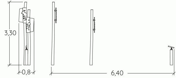 Materiais: Os postes de 120 a 140mm de diâmetro e os painéis são feitos de robínia sem seiva e sem casca. A madeira de robínia é lixada e como é naturalmente à prova de podridão não requer nenhuma proteção química adicional. É igualmente extremamente resistente a ataques de fontes externas (insetos, fungos, variações climáticas), garantindo a durabilidade a longo prazo do equipamento. As figuras são feitas de chapas de alumínio pintadas de 3mm de espessura. O telescópio é feito de aço inoxidável. Fixações de aço inoxidável, protegidas por tampas antivandalismo em poliamida.