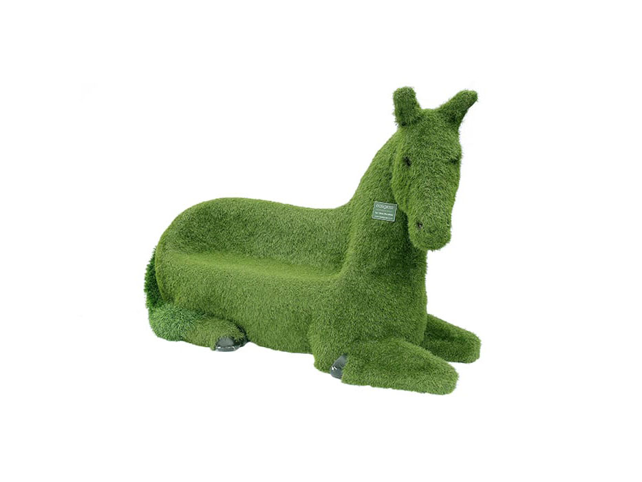 Figura decorativa com a forma 3D de um cavalo deitado com um assento no dorso, resultando também como um original banco de grupo. Este produto tem estrutura interna em GRP com revestimento integral em relva sintética especializada Easigrass na cor verde. Acabamento perfeito e sem juntas. Pode ser usado tanto em espaços interiores como exteriores, exposto a todo o tipo de condições atmosféricas. Muito robusto e durável. Ideal para explorar as texturas e estímulo sensorial, para sentar, brincar, sociabilizar e como elemento decorativo.