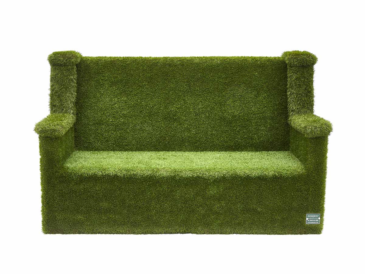 Sofá com dois lugares com estrutura interna em GRP e revestimento integral em relva sintética especializada Easigrass na cor verde. Acabamento perfeito e sem juntas. Pode ser usado tanto em espaços interiores como exteriores, exposto a todo o tipo de condições atmosféricas. Muito robusto e durável. Ideal para explorar as texturas e estímulo sensorial, para sentar, brincar, sociabilizar e como elemento decorativo.